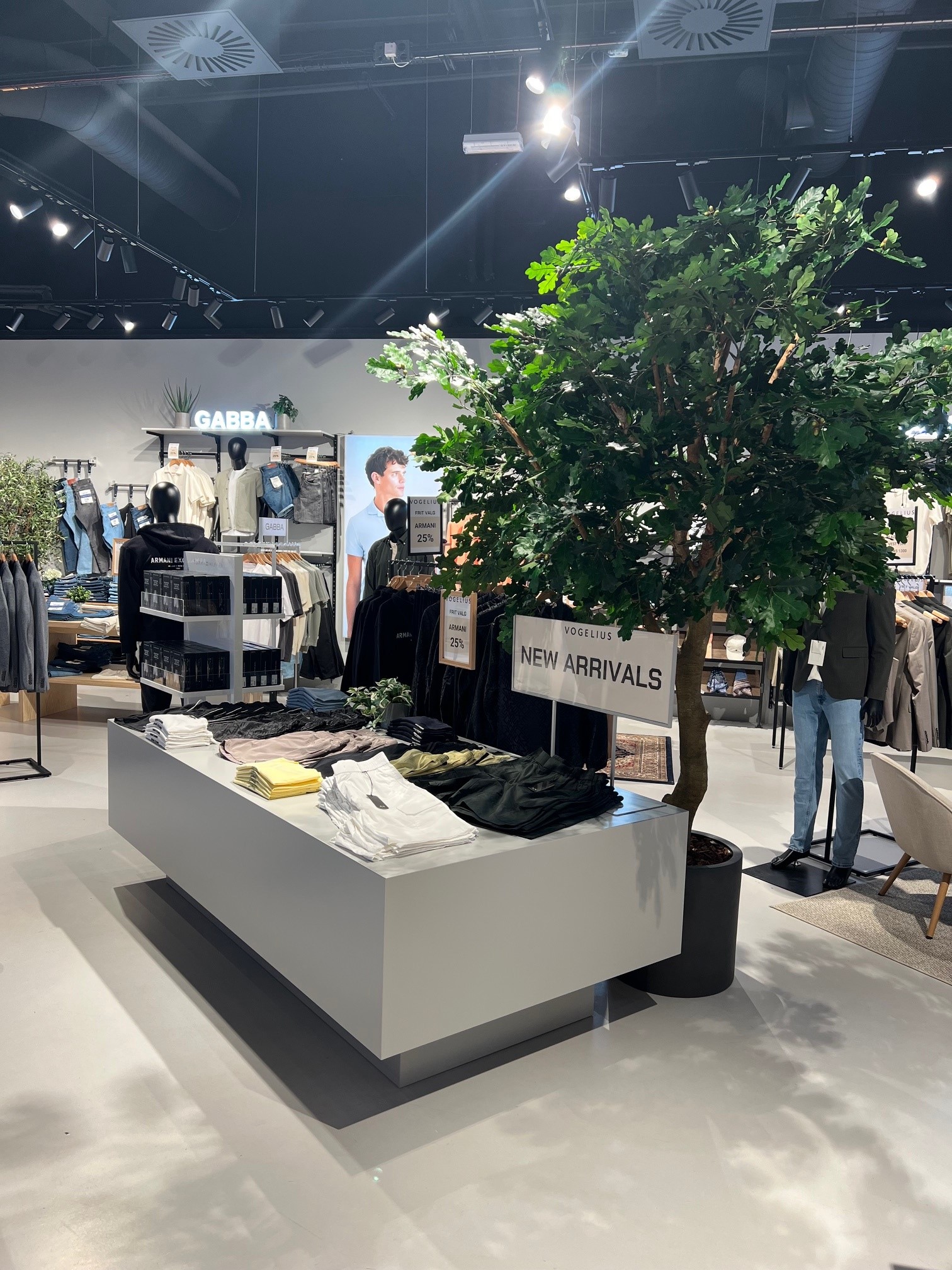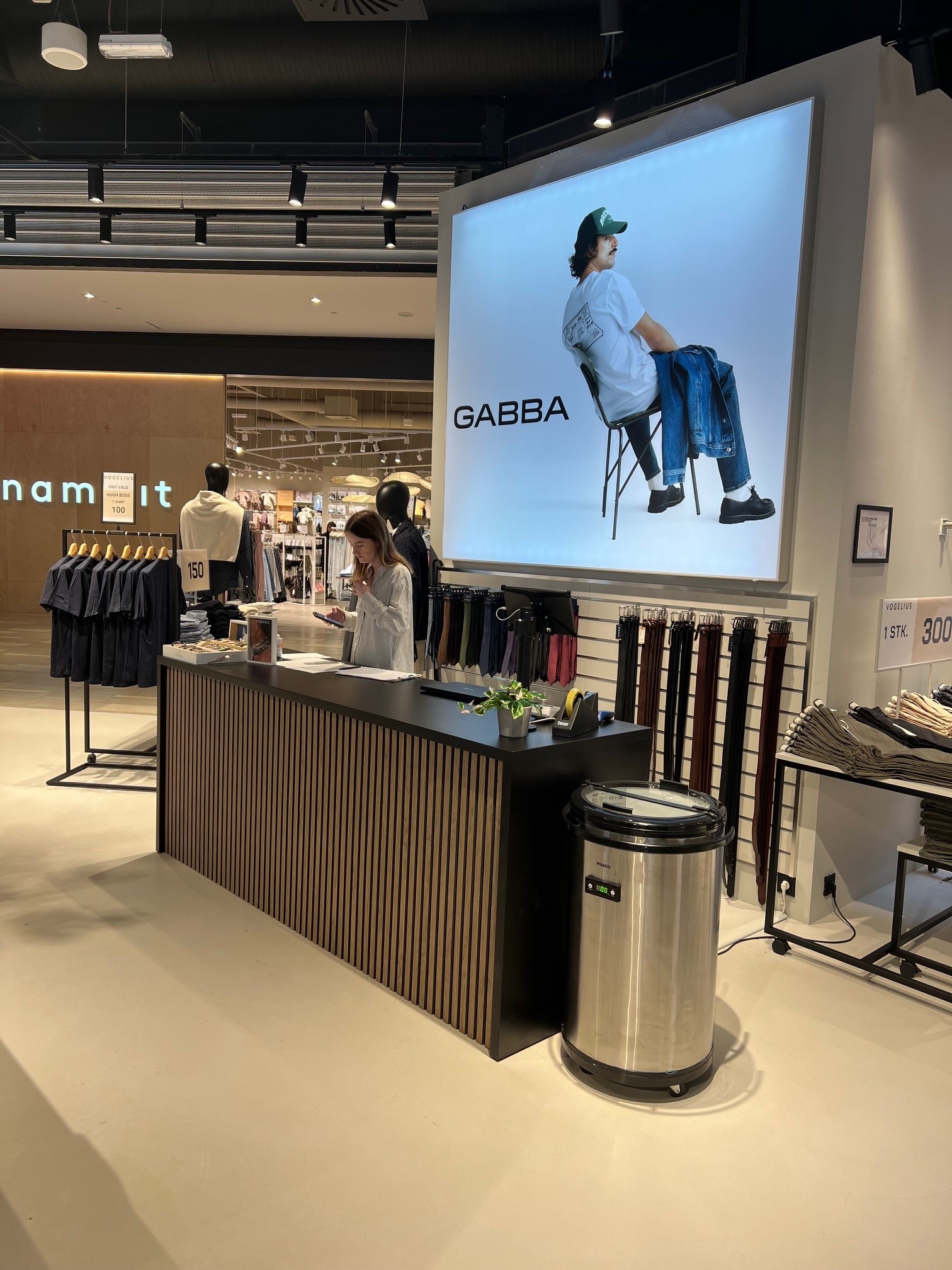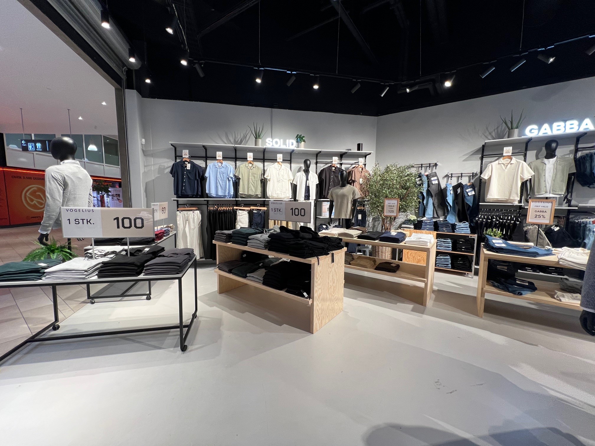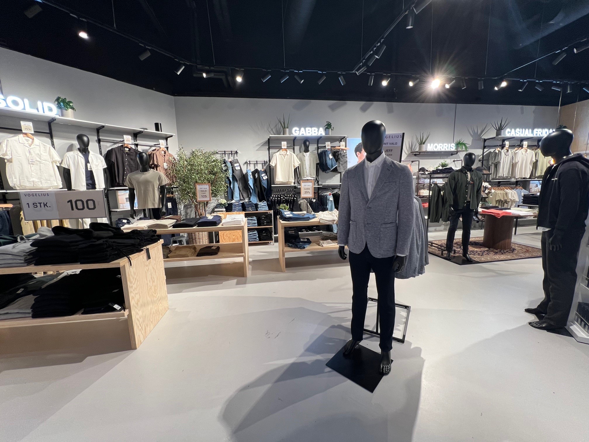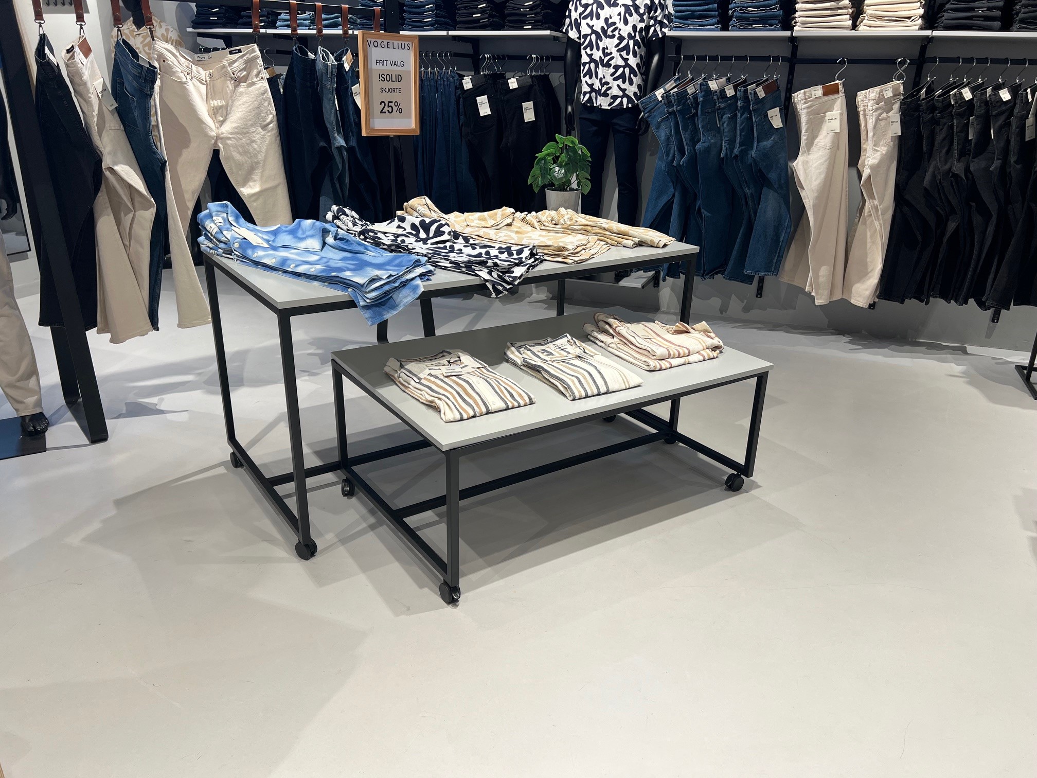 Butikken er indrettet med mange salgsborde / podie borde.