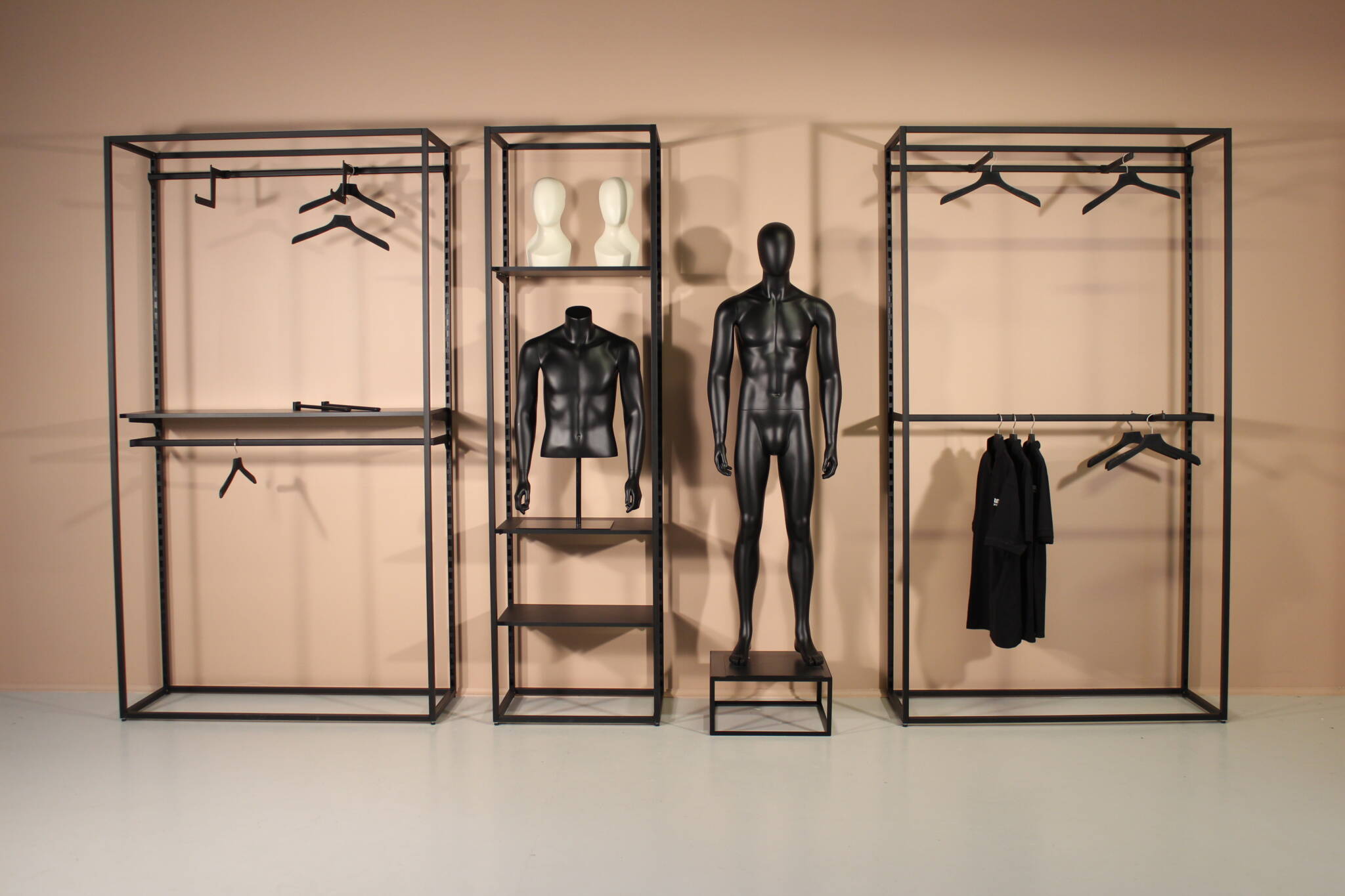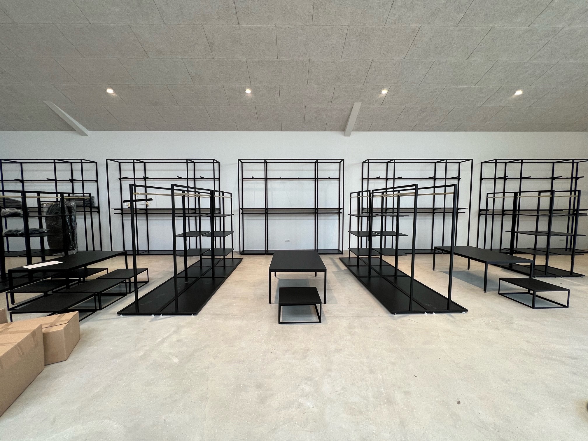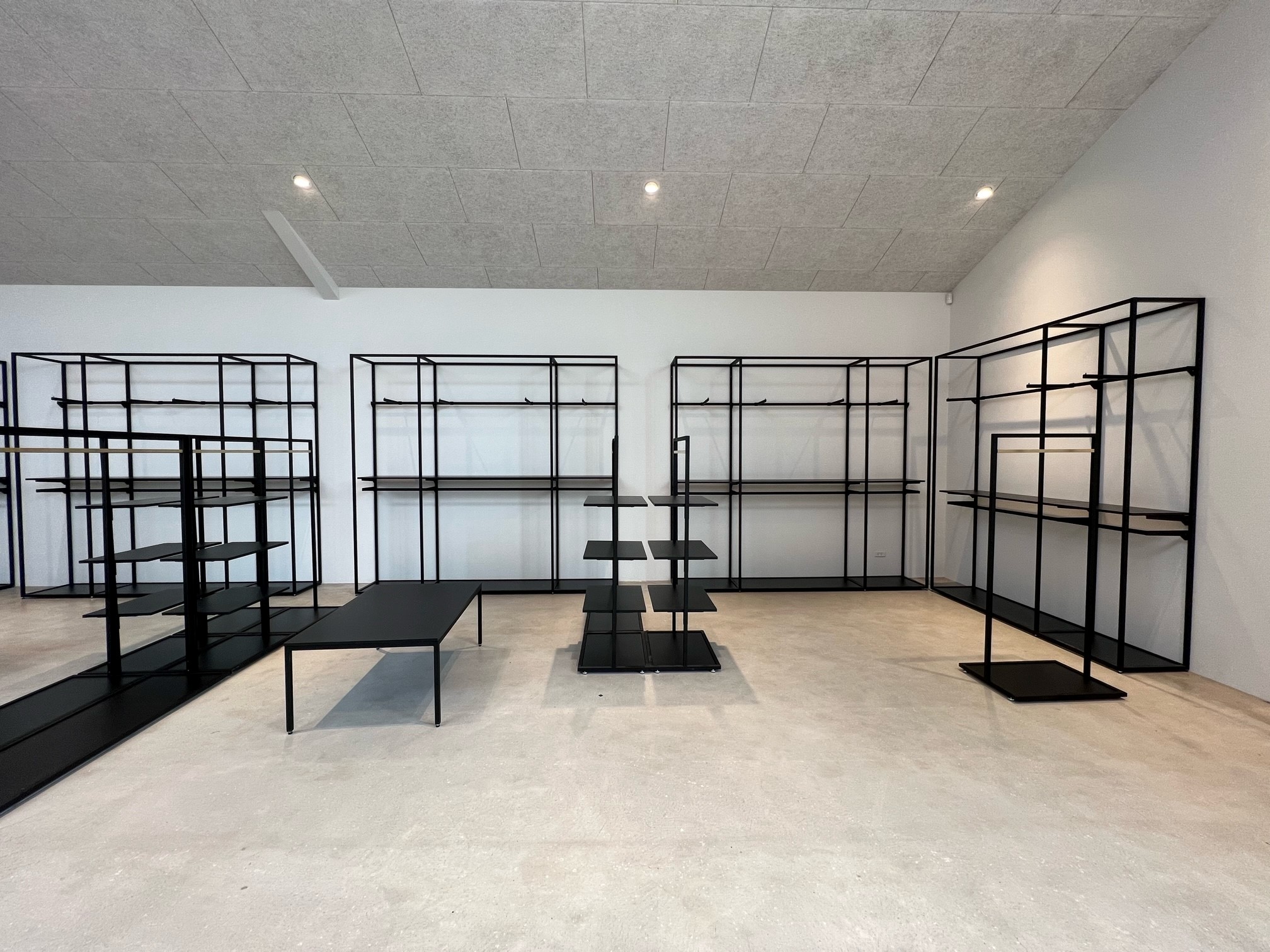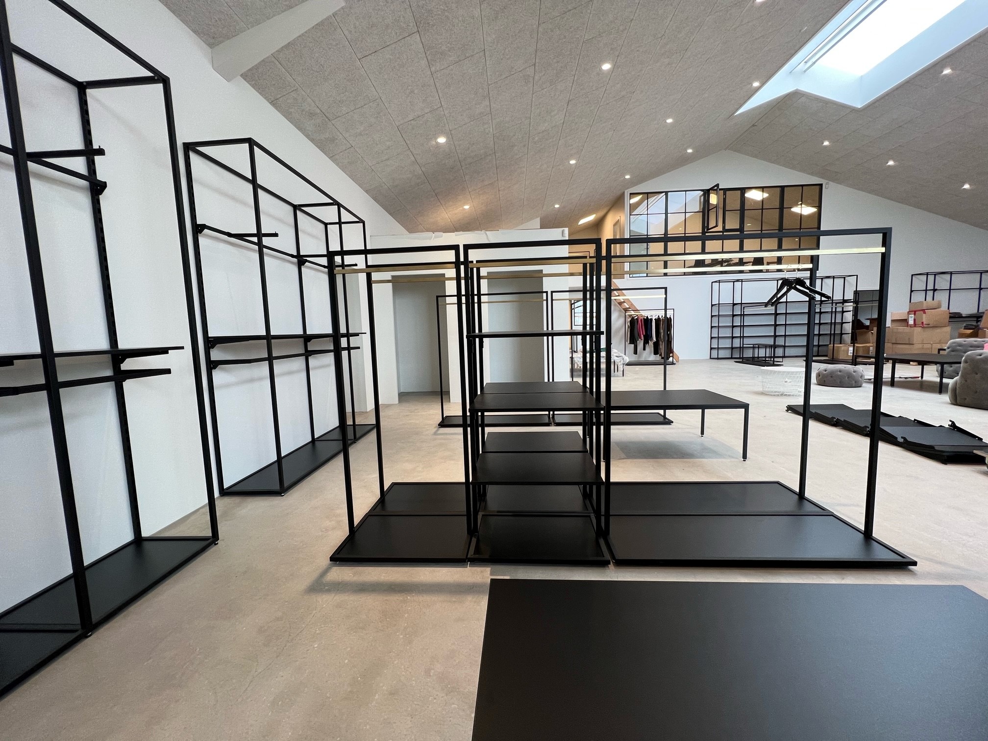 Denne flotte butik er indrettet med sorte reoler langs væggene.