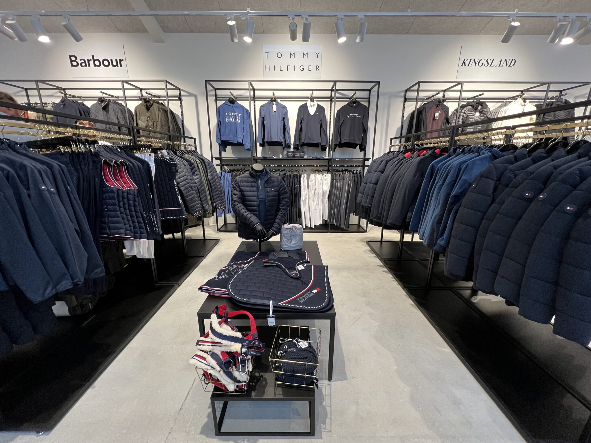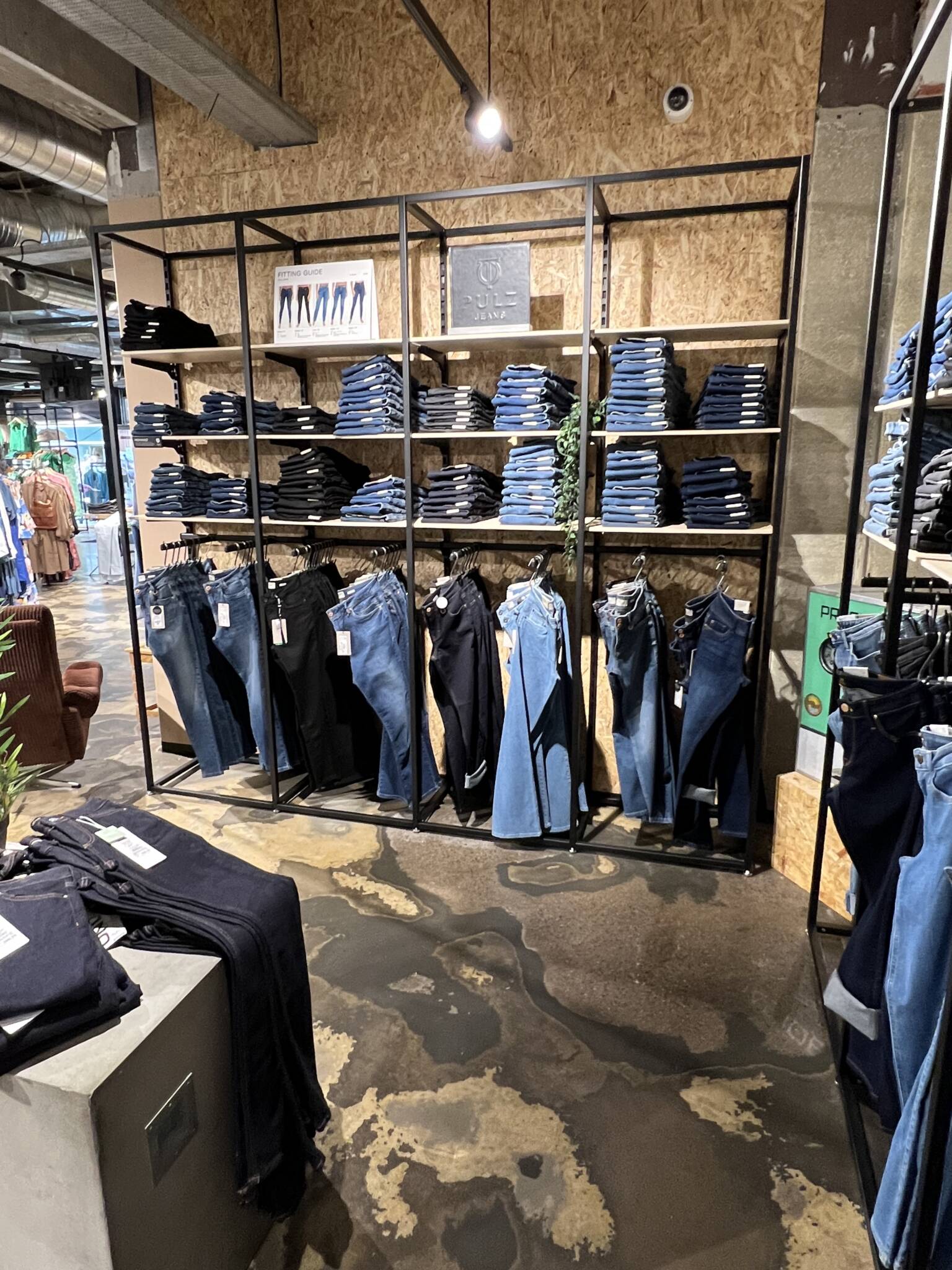 Butikken er indrettet med reoler langs væggene og stativer som rumdelere mellem de forskellige brands.