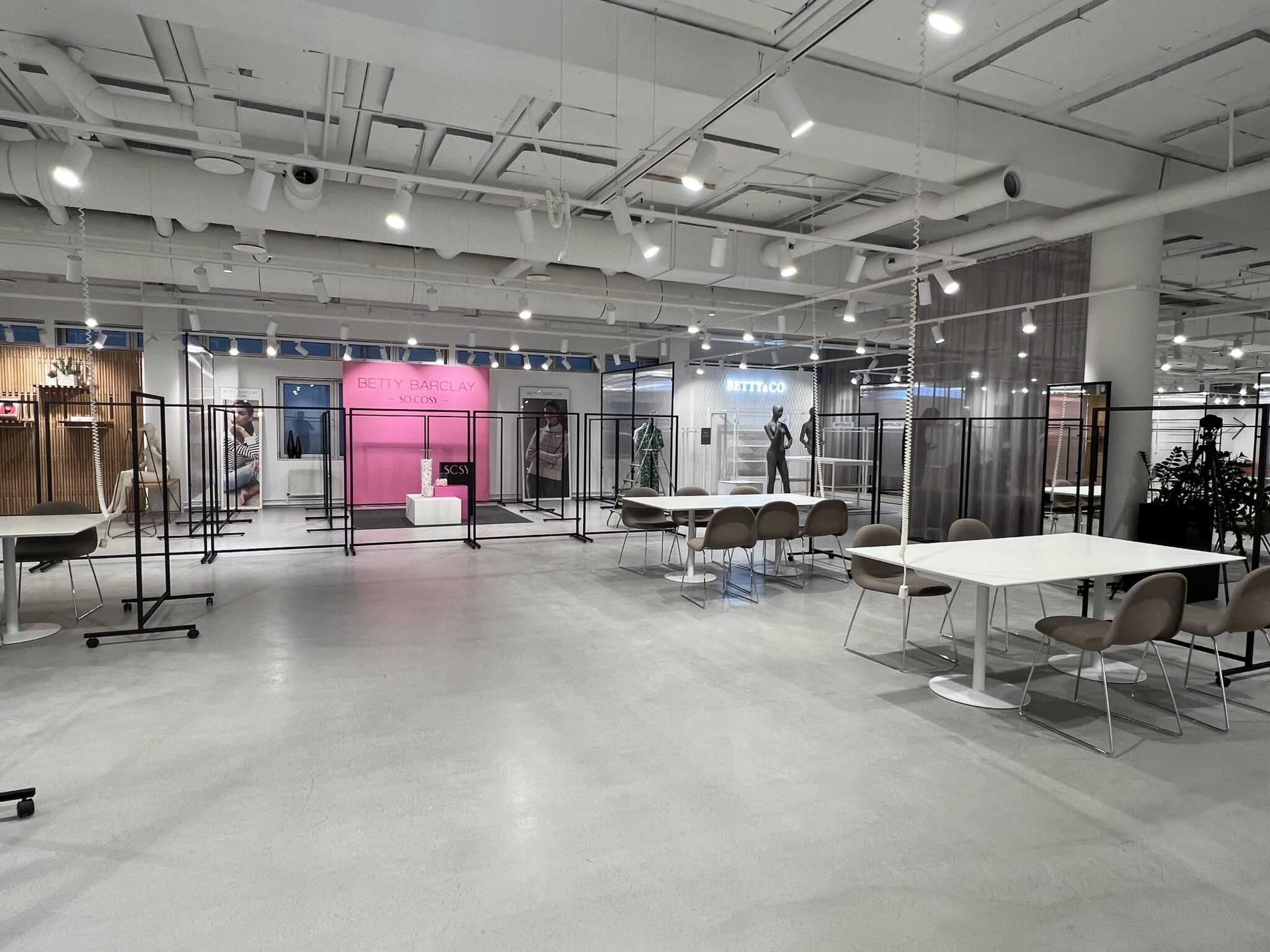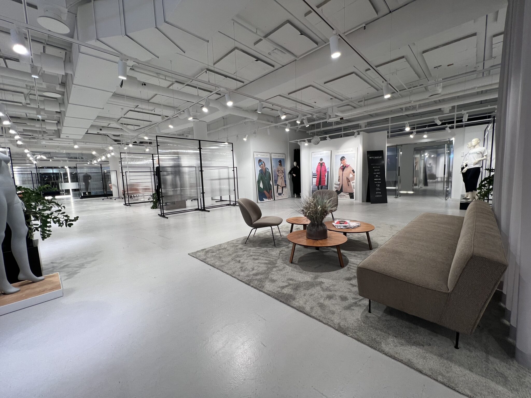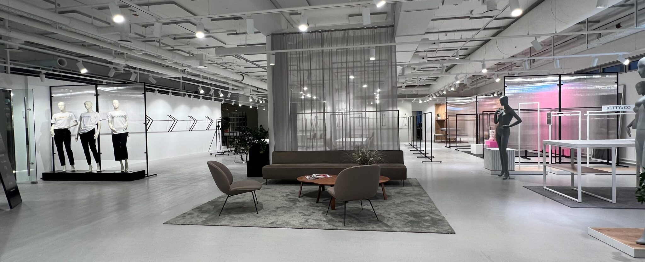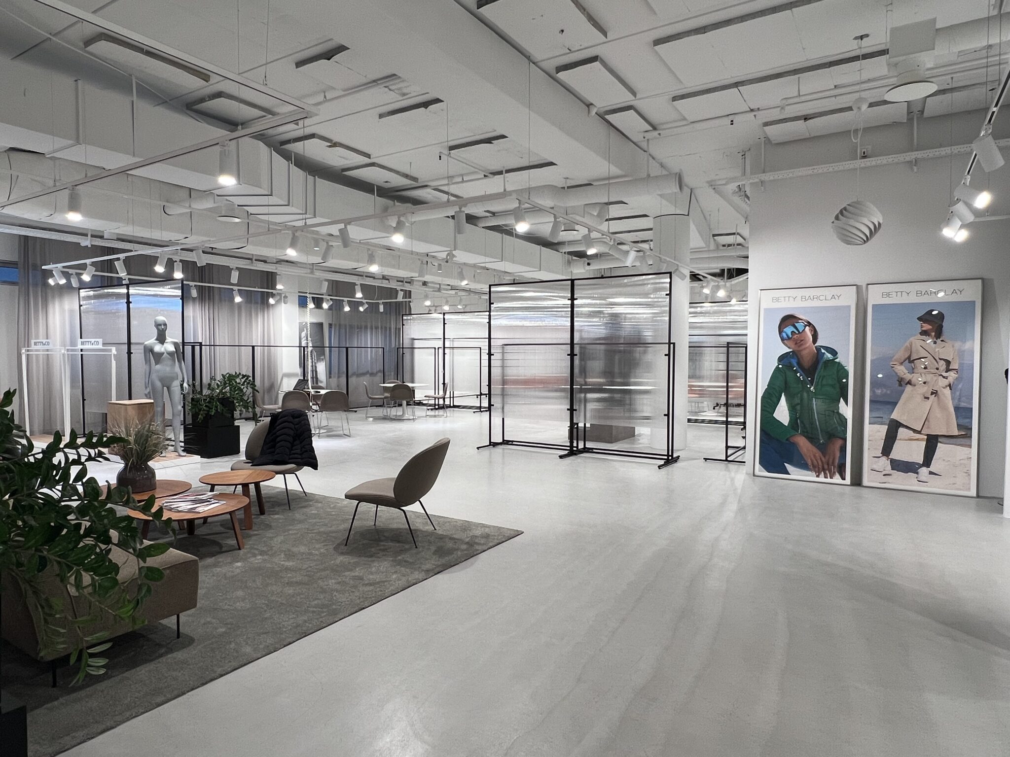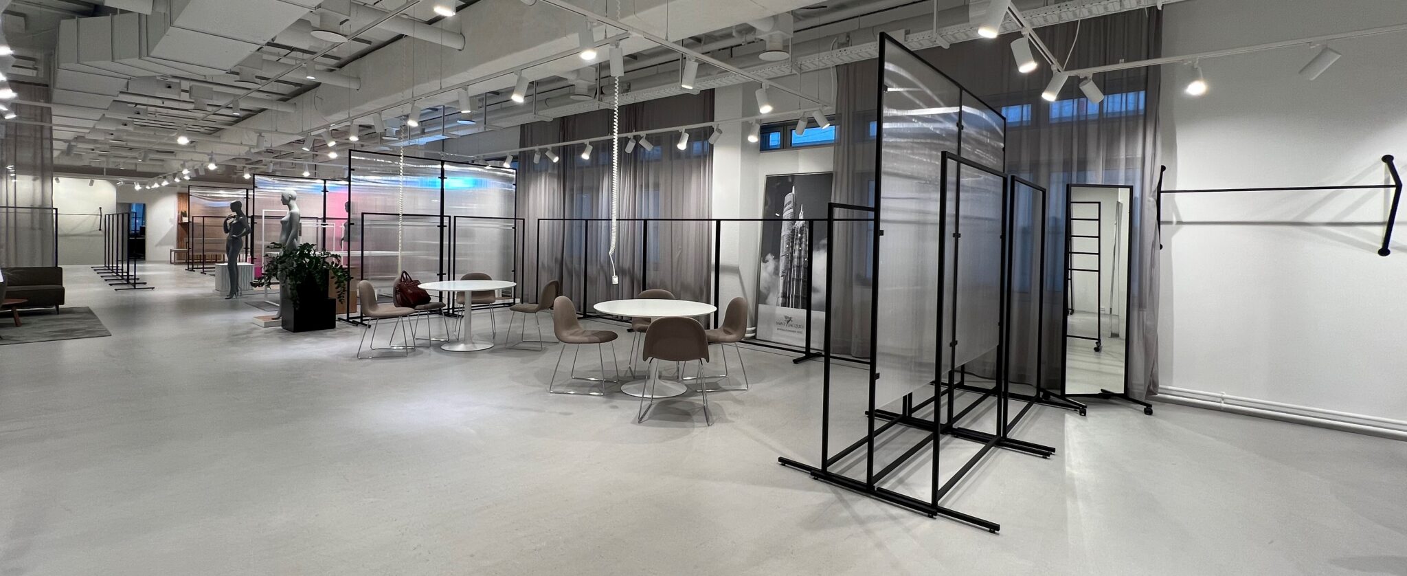 Showroomet er indrettet med høje sorte rum-delere som anvendes til adskillelse af de forskellige brands i showroomet.